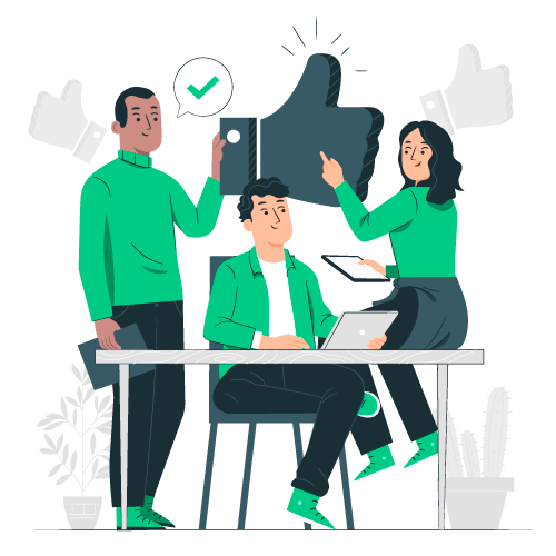 Trois collègues en réunion avec tablettes et ordinateur, icônes pouces levés en arrière-plan.